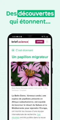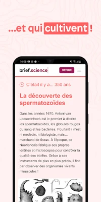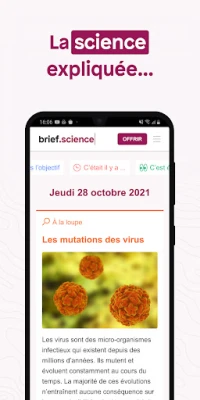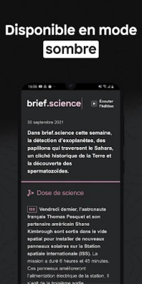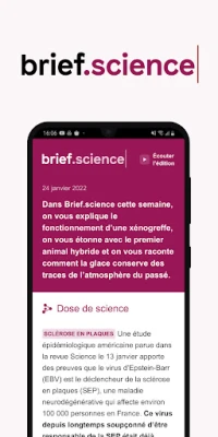 - Une édition par semaine : chaque vendredi à 12h30, Brief.science récapitule les dernières découvertes marquantes et explique un sujet qui fait l’actualité , avec rigueur, curiosité et sans publicité.