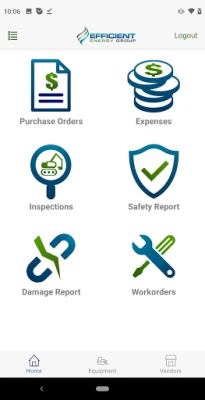 Features Include: Daily Inspections: Create New, View Past and generate reports Purchase Orders: Create New (Add), View Past and generate reports Expenses: Create New (Add), View Past and generate reports Equipment: View the entire Equipment inventory for EEG Damage Report: Now you can report equipment damage from the App and view past activity. Work Orders - Now you can create work orders and assign them to Users. In addition work orders can be created from Daily Inspections and Damage Reports. Time Cards: This is a feature that is coming soon to the EEG App