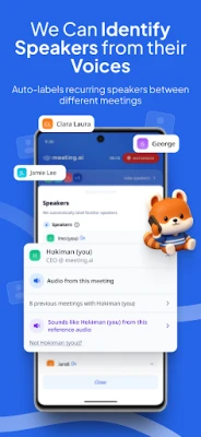 The app recognizes who's speaking and labels them automatically. Tag someone once, and Meeting.ai remembers them forever. Search by speaker name to find what specific people said in any meeting. No more wondering who said what or when important decisions were made.