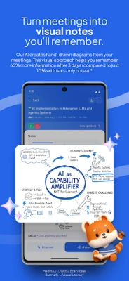 After each meeting, you get hand-drawn diagrams and visual summaries that help you remember 65% more information than text-only notes. Our AI creates visual meeting minutes that actually make sense—turning complex discussions into clear, memorable diagrams you can share with your team.